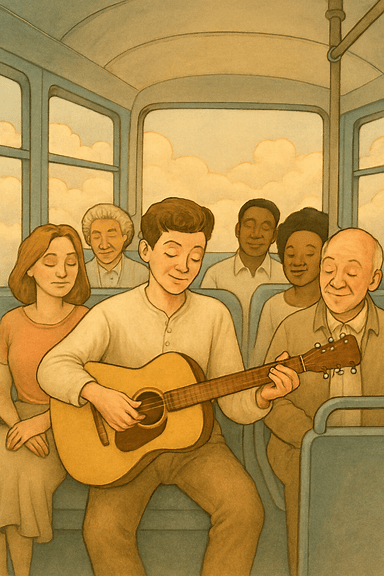 He was brought back to life by the sound of a group of people chattering at the back of the bus. Someone had found an old guitar. It was like the one he’d bought at a jumble sale for ten shillings when he was a kid. A boy, maybe in his twenties, strummed a simple tune but it was music to make your spirits soar.