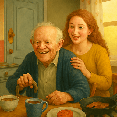 He drooped at the table, head bobbing. His beautiful granddaughter appeared and fussed over him. ‘Sleep well? Do you want cereal or a full English?’ Her caring green eyes dazzled in the morning sun and through her kind mouth she purred, ‘It’s going to be a lovely day. Let’s go to the park, or do you prefer the beach? There are so many wonderful things we can do today.’