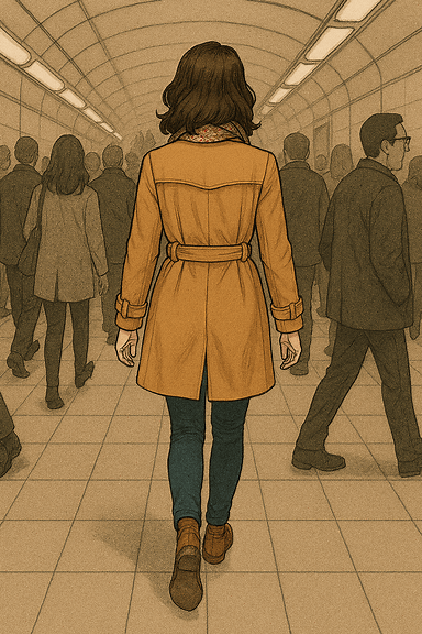 I creep behind her; watching closely. As she makes her way toward the escalator, she exudes a sense of calm determination amid the rhythmic hum of commuter chatter and the gentle clatter of footsteps.