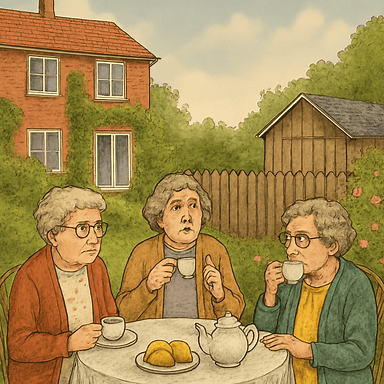 The ladies sat still, listening. Their silence underlined the swishing sound from the shed that was followed by a distinct crack. The women feigned not to notice the suppressed squeal that followed.