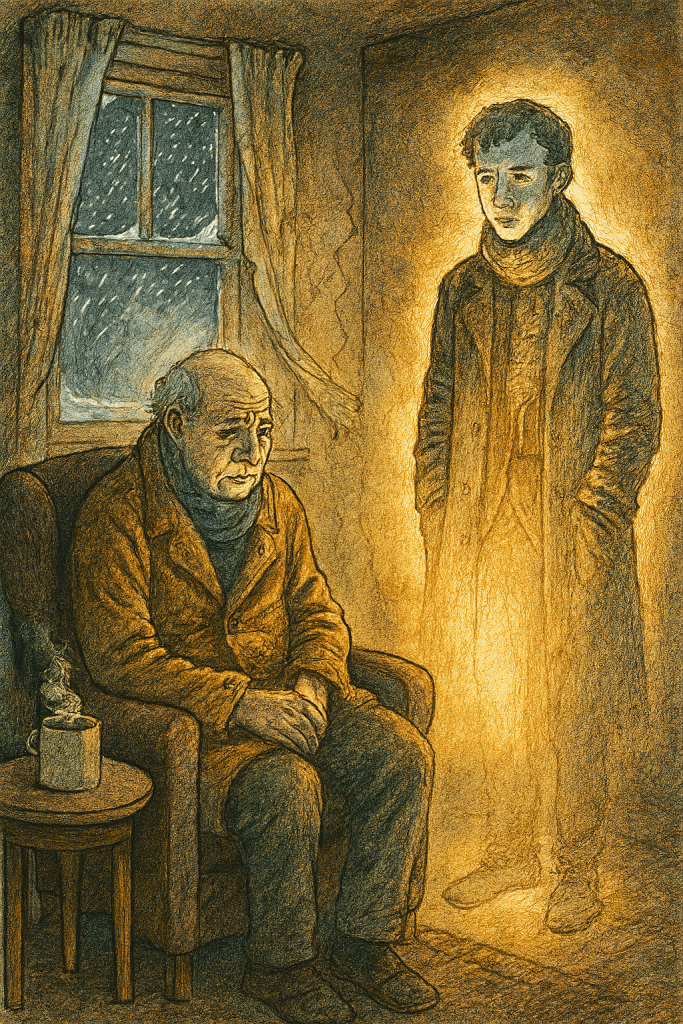 Arthur placed a gentle hand on the youth’s shoulder. ‘You’re not alone now.’ He fetched the chipped mug of tea. The lantern-light faded, replaced by the glow of a single candle on Arthur’s table. The young man smiled, before dissolving into the quiet hush.