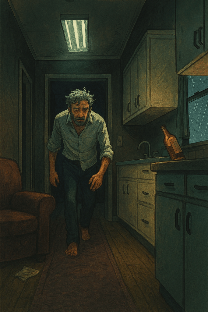 The fluorescent bulb over the hallway flickers as Geoff drags himself from the sofa to the kitchen. An empty whiskey bottle teeters on the edge of the counter.