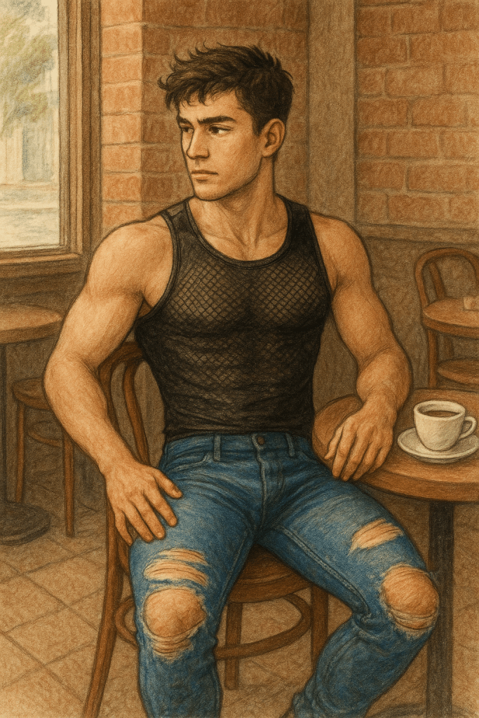 He was obviously a rent boy. He wore tight, ripped blue jeans, affording a tantalising glimpse of red cotton underpants encasing pert buttocks. A tight leather mesh singlet worn over a thin, wiry body, revealed his flat stomach and nipples. Across the café I could see he’d made up his lashes to highlight his dark brown sultry eyes. A slight cheeky smile emphasised dimples on his cheeks.