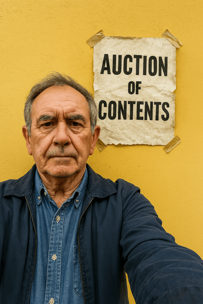 A bold notice Sellotaped to the scrubbed yellow wall read AUCTION OF CONTENTS.