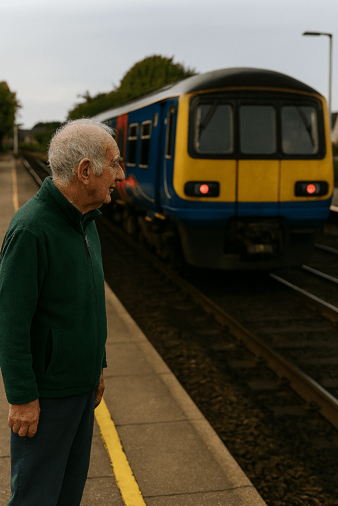 An old man wearing a green Harrington jacket looked straight ahead, took three confident steps across the station platform and threw himself in front of the advancing train.