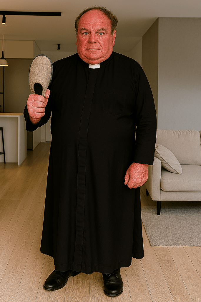 He was in his fifties, flushed in the face and dressed in black, with a white ‘dog collar’ choking him.