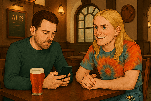 It took a while before I noticed the young man sitting next to me. The pub wasn’t busy and I was a bit miffed that he hadn’t sat somewhere else. But he was a smashing-looking lad, with sparking blue eyes, an apple-cheek complexion and long fair hair.