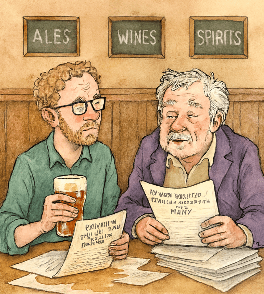 We shouldn’t be in a pub – especially not this pub – too many students get in there. Maybe not the historians, more the layabouts in drama. There was a group in the next cubbyhole; I could smell them.