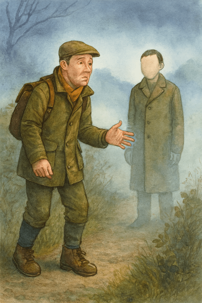 One evening on holiday walking in the wilds of Lincolnshire, he was tired and looking forward to reaching the pub. In the mist he noticed the outline of a young fellow in a trench coat. He looked lost so Andrew, a kind chap, asked, ‘Can I help you?’
