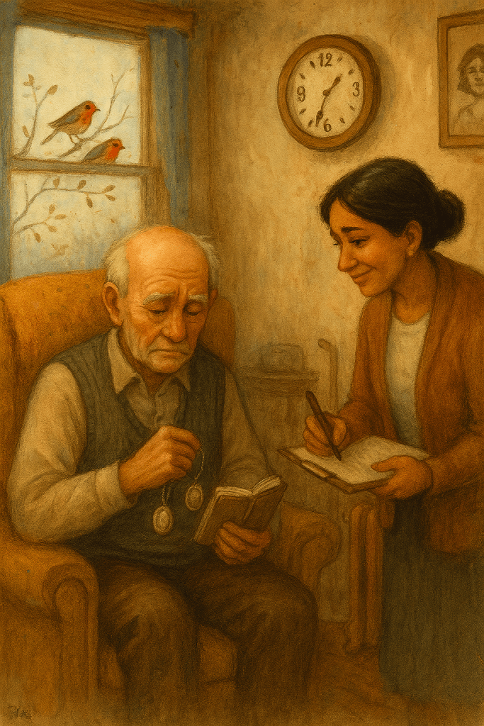 Arthur settled into his faded armchair as the clock chimed nine. Outside, robins darted through early frost, but inside the room lay stillness, punctuated only by the slow drip of an old radiator. The door creaked open and in stepped Mrs. Patel, her clipboard poised like a stern schoolmistress.